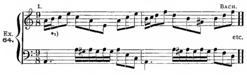 *3) The syncopation of the upper part is continued, symmetrically, for three measures. See also Ex. 6A-3, measures 2 and 3, uniformly irregular; Ex. 54-3 (the irregular division of the first beat is sufficiently, if not totally, balanced by similar treatment of the next accent, — 3rd beat). See also Bach, W.-t. Cl., Vol. I, Prelude 13, measures 2–4; Vol. II, Prelude 13, measures 1, 2.