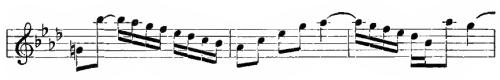 See, further, Ex. 44-2 (16th-triplets at first in lower, and then in upper part). Ex. 52-1, — the rhythm of 16th-notes in alternating parts during two measures; then maintained for a time in upper part alone. — Ex. 52-2, similar. — Ex. 55-3.