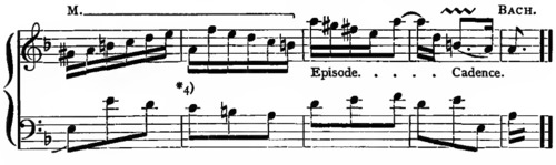 *2) The “Episode” is interpolated already after the first Imitation; it is derived from the Counter-motive in the upper part (2nd measure), which is retained (or imitated) in the lower part in a somewhat modified form, and accompanied by a new contrapuntal figure in the upper part.