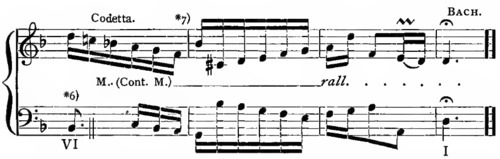 d. Sometimes, however, this cadence is evaded, by using the chord of the VIth step instead of the Tonic, in which case a brief Codetta is added. For illustration: