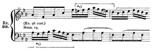 *1) The Third Section begins, after an elision, with the M., again in the lower part; see Ex. 94, Note *1). It immediately modulates down into the Sub-dominant key; see par. 43; also Ex. 57, No. 1 (par. 19d).