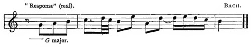 By this means the Response is retained for an instant in the original key, until perfect adjustment, at the beginning, is secured. It is called the “tonal” Response because of this (at least temporary) adherence to the tonality of the Fugue; the Tonic elements being answered by the Dominant, and the Dominant elements (where salient) by the Tonic (imitation in the 4th).