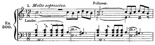 202. In order to appreciate the significance of the Canon-form, it should be contemplated in the abstract, aside from its uninviting mathematical aspect. As has been observed, each successive time-interval (one measure, or whatever section it may be) of the Leader is a counterpoint to the preceding section; that is, each such member is a product of the preceding one, through the strictest and most obvious process of logical derivation, or cumulation. The fact that the leading voice may thus accompany itself, may fit into itself, member by member, indicates a degree of cohesion and consistency of evolution which vindicates the rank of the Canon among those art-forms whose merit is founded upon close logic. This being the case, it is evident that the essential properties of the form are all present in the Leader alone, whether actually accompanied by the Follower or not; and though it might be injudicious ever to advocate the complete omission of the Follower,[*] it is interesting to question to what extent the presence of the Follower should be emphasized, — in other words, to what degree the canonic imitation should be made clearly recognizable. It is generally acknowledged that the merit of a Canon increases as the evidences of canonic labor decrease; that the more freely and naturally the leading voice runs, the more perfect the Canon; the less it betrays of its contrapuntal origin, the dry mathematical fact that one part is obstinately dogging the other, the better. Hence, the doctrine may be defensible, that a Canon need not be recognizable as such; but with one limitation, namely, not incessantly recognizable. The beauty and attractiveness of the act of Imitation, the calling of voice to voice, is so real, and so greatly appreciated by even the untutored musical listener, that it should not be banished from an art-form which, at its best, does not exhibit an excess of external beauty and grace. The proper balance between unimpassioned logic of structure on the one hand and romantic charm on the other, is most nearly achieved in the 8ve-Canon, with harmonic accompaniment, in which provision is made for clear formal arrangement, and for fairly frequent evidences of the canonic imitation. Review par. 192b.